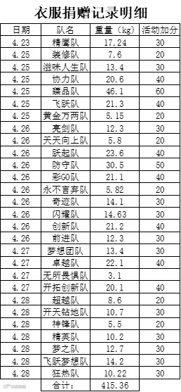 本次活动以安费诺文化圈的为单位积极参与募捐,共吸引28支队伍热情加入,活动共募集旧衣物达到425.36公斤(有效重量267.50公斤),包含成人及儿童各类各季节衣物。每一件温暖的衣服,都饱含着爱心的温度;每一个小小的善举,都传递着满满的能量。活动组织者的辛勤付出,爱心同事的无私奉献,让此次旧衣募捐硕果累累。
