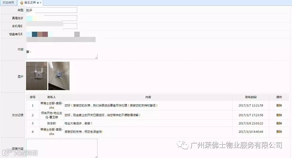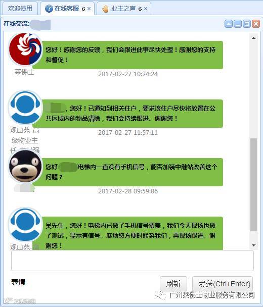 ③业户向我们物业反馈电梯没有信号,我们客服即时回复并联系物业解决处理。