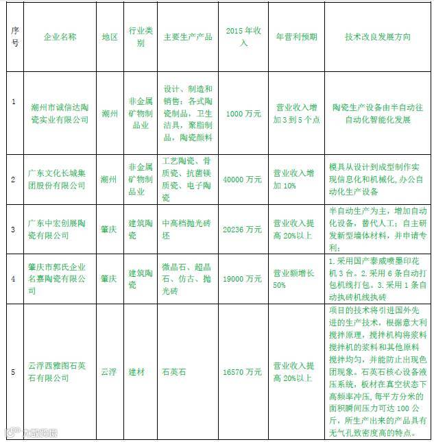 5家广东省具代表性陶瓷企业营收情况汇总表(排名不分先后)