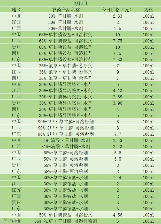 📅 2 月 4 日草甘膦类农药零售价(100ml 规格)