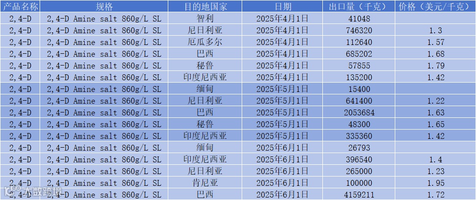 6 月巴西出口量占比超 83%,直接带动全球总出口量环比增长近 60%,南美种植旺季是 2,4-D 制剂需求的核心驱动力 - 价格韧性较强