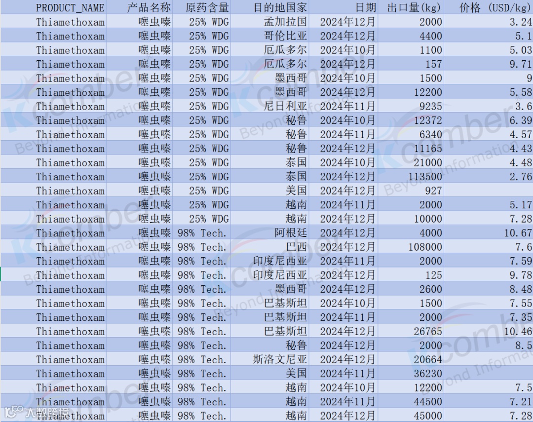 2024 年 10–12 月,噻虫嗪出口呈现出“制剂放量、原药走强、价格分化”的特征:25% WDG 在泰国大单推动下实现快速增长,而 98% Tech. 则由巴西、巴基斯坦等市场拉动需求回暖。整体看,噻虫嗪的出口结构在 Q4 出现明显调整,量价信号值得关注。