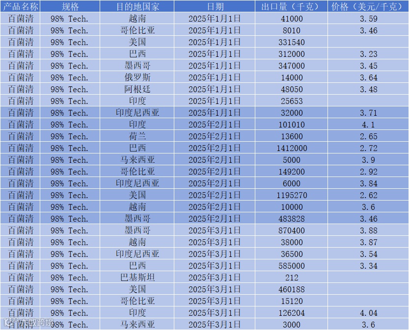 2025的1月到3月,百菌清 98% Tech. 的出口情况,美国、巴西以及墨西哥组成了“出口三巨头”,占据了全球大部分市场份额。本篇用最新出口数据带你看清这波全球百菌清采购的真实节奏。