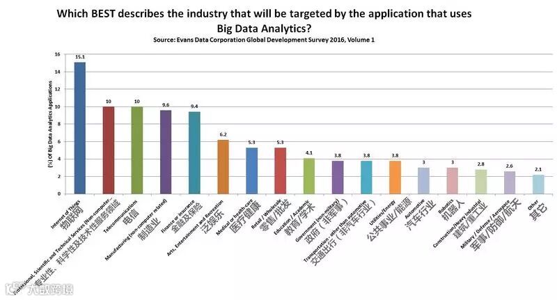 从下图可以看出使用大数据分析技术的软件开发者在开发新应用时的各行业投入比例:很明显,他们将大部分时间花费在了 “物联网(IoT)” 方面;而第二大受欢迎的大数据分析技术应用软件主要集中在专业性技术性较强的服务领域,并列第二的还有电信行业;制造业(非计算机相关行业)则排在第三位。