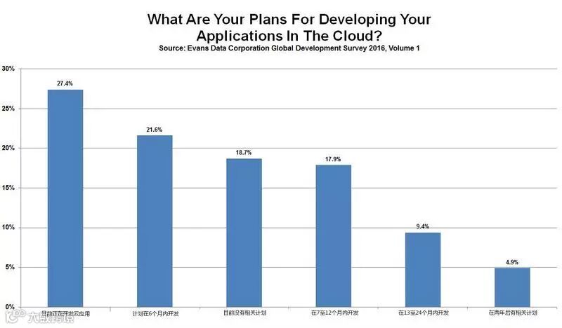 全球近 1/3(27.4%)的开发者正计划在云端开发新的应用软件。66.9%的开发者期望在 1年 内完成一个新的云端 app 开发项目。从总体上来看,在所有参与调查的开发者中,有 81.3%正在创建云应用。