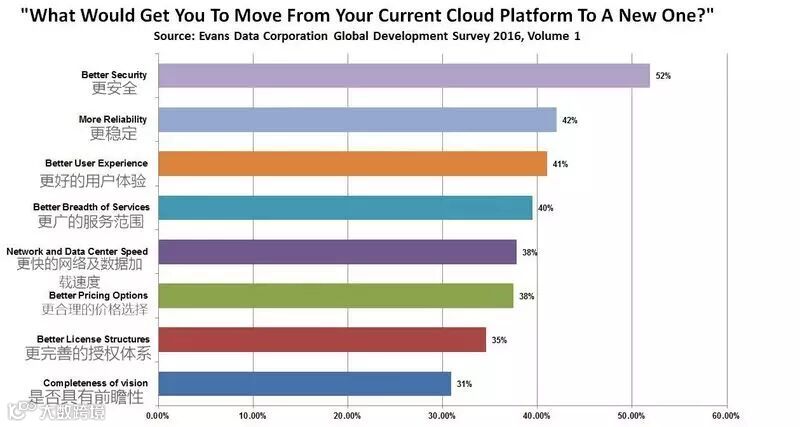 “更安全”“更稳定” 以及 “更好的用户体验” 是促使开发者迁移到另一个云平台的最主要因素。其他附加考虑的因素还包括 “ 服务范围更广 ” (39.4 % )、“ 网络及数据加载速度更快”(37.8%)、“价格选择更合理 ” ( 37.5% )、 “ 授权结构更完善 ” (34.6%)以及 “ 是否更具有前瞻性”