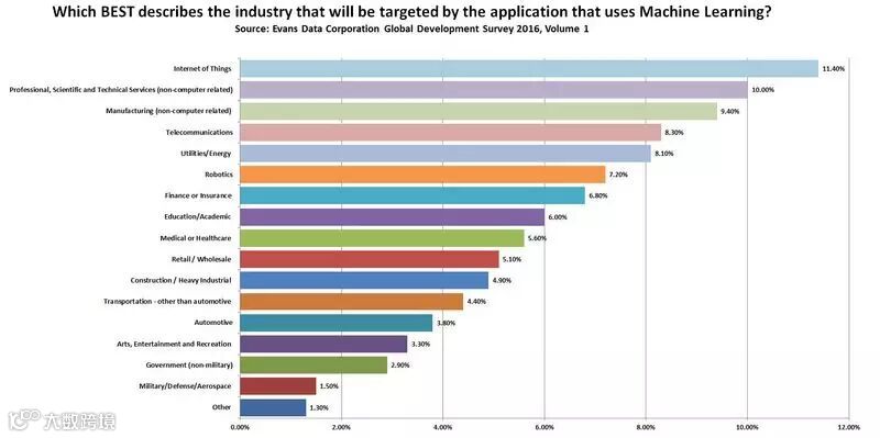 运用机器学习技术最多的 app 开发行业是物联网(11.4%)、专业性技术性较强的服务(10%)及制造业(9.4%)。其他运用此技术较多的行业还包括电信(8.3%)、公共事业 / 能源(8.1%)、机器人技术(7.2%)以及金融 / 保险业(6.8%)。