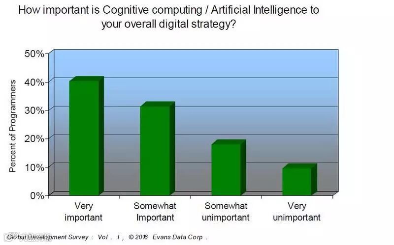 41%的开发者表示 “认知计算” 与 “人工智能(AI)” 对自己的数字战略非常重要。在与企业服务类公司高管的交流中研究者发现,为用户提供订阅模式的人工智能类服务越来越受到重视,全球范围内许多得到投资的开发项目也是以此为发展目标。
