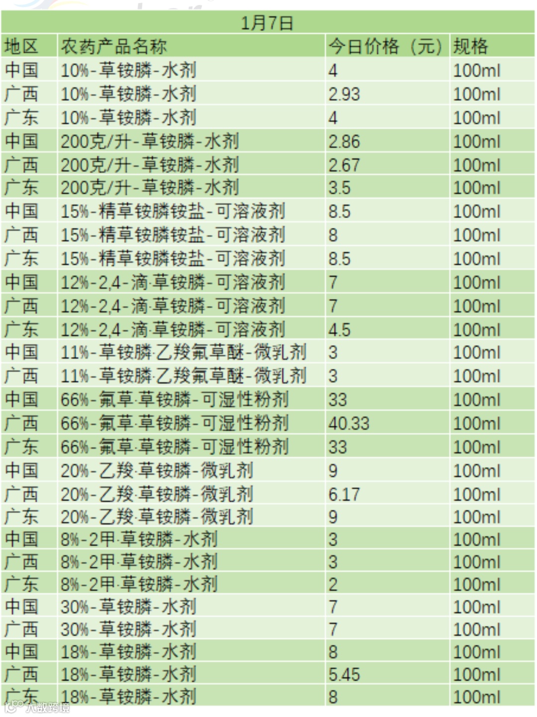📅 1 月 7 日草铵膦类农药零售价(100ml 规格)