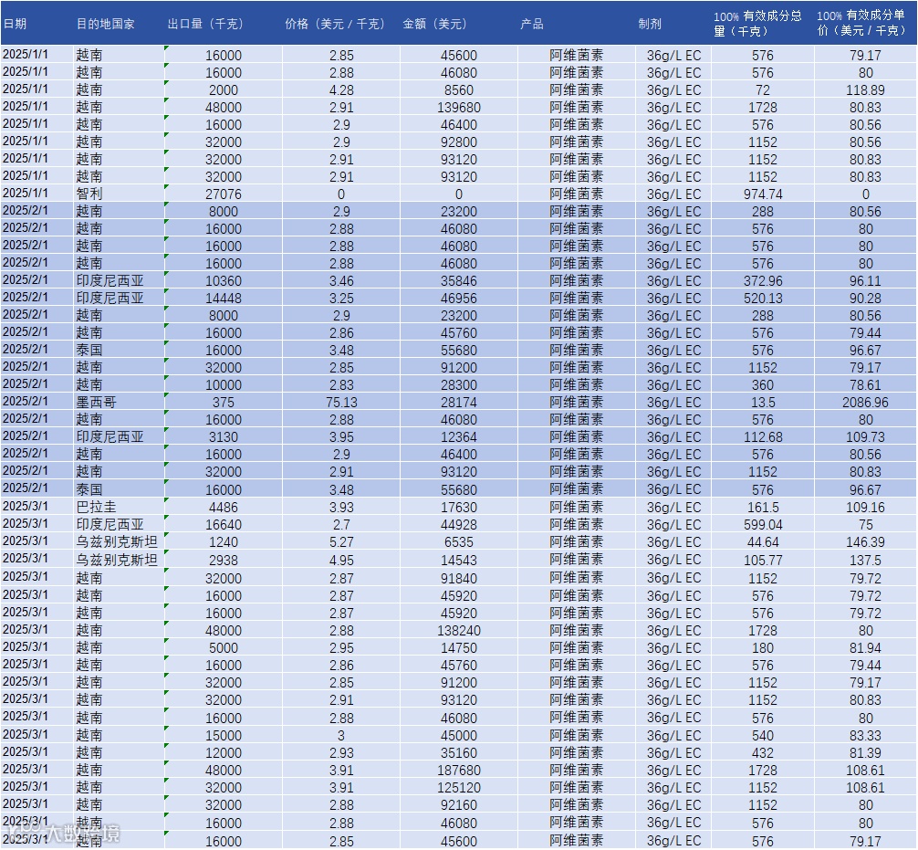 从出口流向来看,越南是阿维菌素 36g/L EC 的绝对核心市场,三个月均保持高频、小批量持续出货的特征: