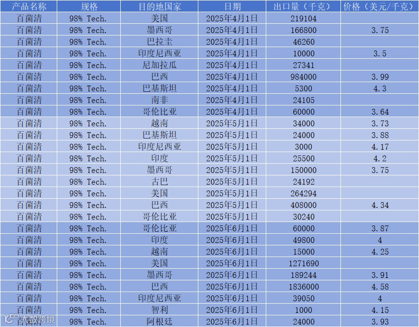 2025 年第一季度,百菌清 98% Tech. 的全球采购还由美国、巴西、墨西哥 “三巨头” 主导;进入 4-6 月,随着南美种植旺季的全面启动,市场格局已进一步向巴西倾斜。巴西以绝对优势领衔量价齐升,美墨市场需求分化,新兴市场持续发力。本篇将用最新出口数据,带你看清这波全球百菌清 98% Tech. 采购的真实节奏与区域重构。