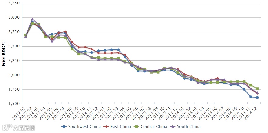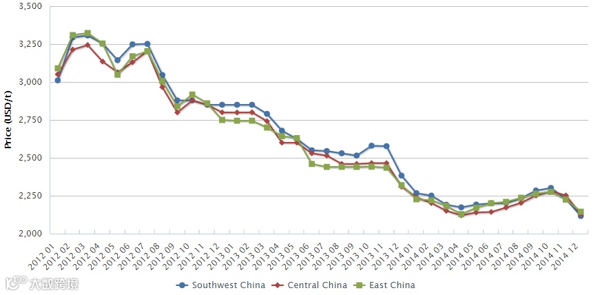 Ex-works price of Rutile TiO2 in China by region, mid-Jan. 2012–mid-Dec. 2014