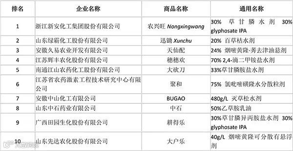 除草剂品牌产品排行中,浙江新安化工集团股份有限公司的“农兴旺”(30%草甘膦水剂)排名第一位,山东绿霸化工股份有限公司的“迅锄”(20%百草枯水剂)排名第二位。另外包括以2,4-滴、乙草胺、灭草松等活性成分为配方组分的制剂产品也进入了十强。