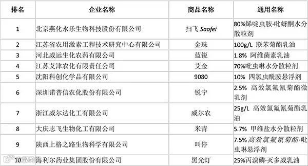杀虫剂排行前十强中,乳油剂型最多,水分散粒剂次之,活性成分以菊酯类为多。燕化永乐的“扫飞”(80%烯啶虫胺•吡蚜酮水分散粒剂)荣获第一,另外值得一提的是,沈阳科创的自主产品9080(10%四氯虫酰胺悬浮剂)也进入十强,位列第五。