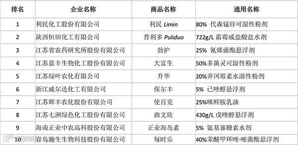 2015年5月7日,中国农药工业协会CCPIA发布2014年中国植保市场品牌销售排行榜。这是以销售额为排名指标的。从整体上看,2014年中国植保市场品牌产品销售情况比较好的,大部分是使用比较广泛的老产品。虽然也有部分新产品上榜,但在数量上还是远远少于老产品的上榜数量。这也说明了老产品具有比较该广泛的覆盖面积,深受广大消费者的欢迎,同时农民的消费习惯具有持续性。在此次的榜单中,有四家企业分别有两个品牌产品上榜,分别是江苏辉丰农化股份有限公司(使百克(25% 咪鲜胺乳油)和穗穗欢(70% 2,4-滴二甲铵盐水剂)),江苏七洲绿色化工股份有限公司(曲文欣(430g/L戊唑醇悬浮剂)和果全用(15%多效唑可湿性粉剂)),浙江威尔达化工有限公司(保尔丰(5% 已唑醇悬浮剂)和威尔农(25g/L 高效氯氟氰菊酯乳油))和四川国光农化股份有限公司(生跟(20%萘乙酸粉剂)和耕得乐(30%草甘膦异丙胺盐水剂))。