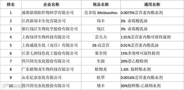 植物生长调节剂排行前十强中,以芸苔素内酯和赤霉酸为主要活性成分。成都新朝阳作物科学有限公司的“美多收”(0.0075%芸苔素内酯水剂)国内销售额排名杀菌剂品牌产品第一位。