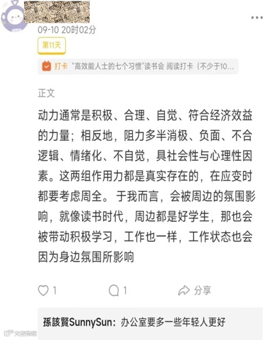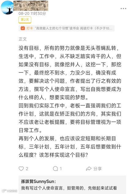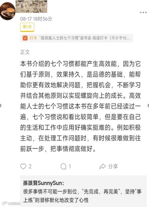 8月16日,闪耀队启动了新一季的读书分享会2.0线上版。之所以称作2.0版,本次读书告别厚重的纸质图书,小伙伴们上下班通勤,茶余饭后,夜深人静打开手机就能阅读的电子书。阅读笔记也使用朋友圈模式,离开传统的笔和纸,用APP记录在微信小程序里,随时随地记录,分享和交流。另外,本次读书设置阅读进度,读书会要求每周阅读两三个章节,且每周需要打卡三次,读书笔记至少100字的规定。
