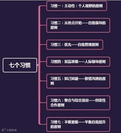 而首次读书会的主角是《高效能人士的七个习惯》,作者史蒂芬·柯维博士是美国学术界的“伟大思想家”。这本书是企业、组织的必读教材,也是个人在生活中实现自我完善的必读教材。这本书包括以下七个章节。