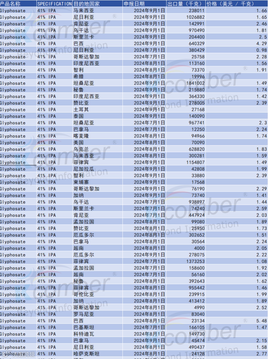 数据来源:Tranalysis(CCM 出口数据平台),本文所列数据基于2024 年 6–8 月草铵膦主要出口市场量价分布。