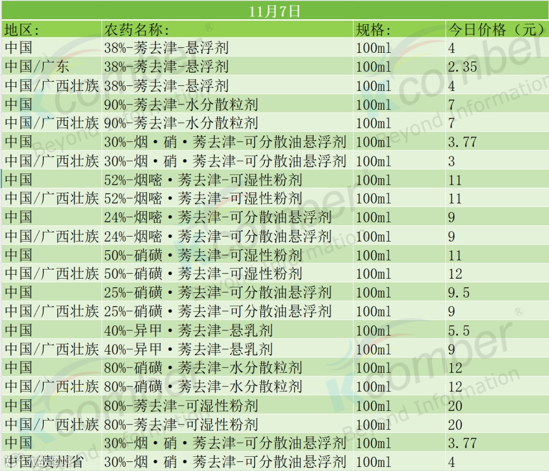 30%-烟·硝·莠去津-可分散油悬浮剂:全国均价3.77元,广西3元,贵州4元。