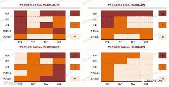四个图表中,横轴是产业链上下游即农资、生产、加工和流通,纵轴是农产品属性。通过这两个轴分成不同的细分领域。左上是农企规模分布(大众市场,平价农产品),深色是该细分领域大型企业较多,浅色是该领域主要是中小规模企业;左下是高端市场(比如有机农业和有机食品)的农企分布;右边是农企的性质分布,深色说明国资企业暂居市场主导,浅色说明该领域市场更自由,民企居多。