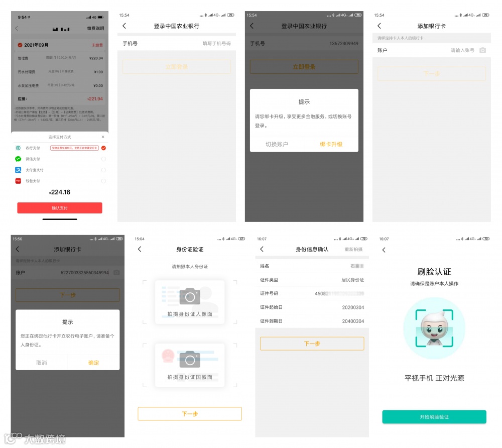 进入付款页面,选择【农行支付渠道】- 填写手机号 - 选择“绑卡升级”添加支持的银行卡号(建设银行、中国银行、工商银行、交通银行)- 身份证验证及确认 - 刷脸认证 - 完成付款。