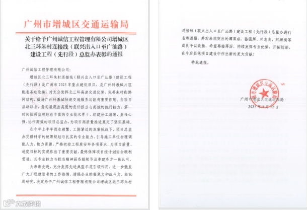 近日,广州市增城区交通运输局向诚信公司发来通报,对诚信公司增城区北三环朱村连接线(联兴出入口至广汕路)建设工程(先行段)总监办提出表彰,对诚信公司展现出的高度的责任担当与高效的执行能力表示认可。