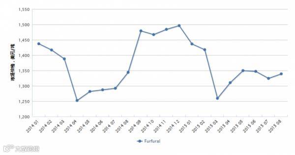 据CCM数据显示,2015年8月中国糠醛市场价格为8,190元/吨(USD1,338.9/t),较7月份价格8,100元/吨(USD1,324.2/t),小幅上涨1.2%,但与1月市场价格8,790元/吨(USD1,436.4/t)相比已经下跌了6.8%。
