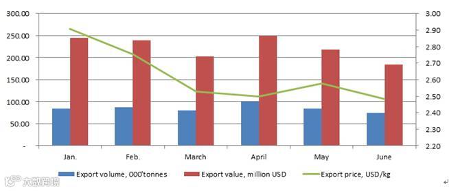 2015年上半年,除草剂制剂产品出口的平均价格大概是2.62美元/千克,同比下 降了18.85%。而且,今年1-6月,除草剂制剂的出口价格是程逐月下跌趋势的。根据中国海关总署统计数据显示,6月除草剂制剂平均出口价格比1月份的 大概下降了14.78%。随着平均出口价格的下跌,出口金额也将随之减少,尤其是当出口量仅保持小幅度增长的前提下。