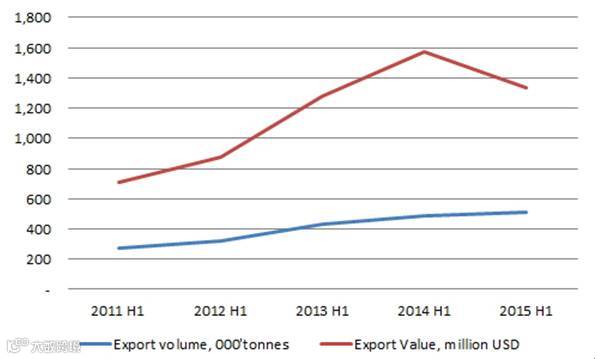 Figure 2: 2011年上半年-2015年上半年,中国除草剂制剂出口数量及金额(English)