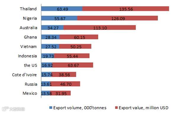 出口目的地方面,泰国仍是中国除草剂制剂产品进口量及进口金额最大的国家。其中进口量达到63.49千吨,占2015年上半年中国除草剂制剂出口总量的 12.46%;进口金额达到135.56百万美元,占中国除草剂制剂总出口金额的10.13%。紧跟其后的是尼日利亚和澳大利亚。中国除草剂制剂出口量前 10位的国家和地区以出口总量288.87千吨占中国总出口量的56.69%。