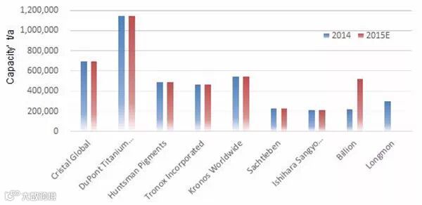 图1:全球主要钛白粉企业产能状况,2014-2015E