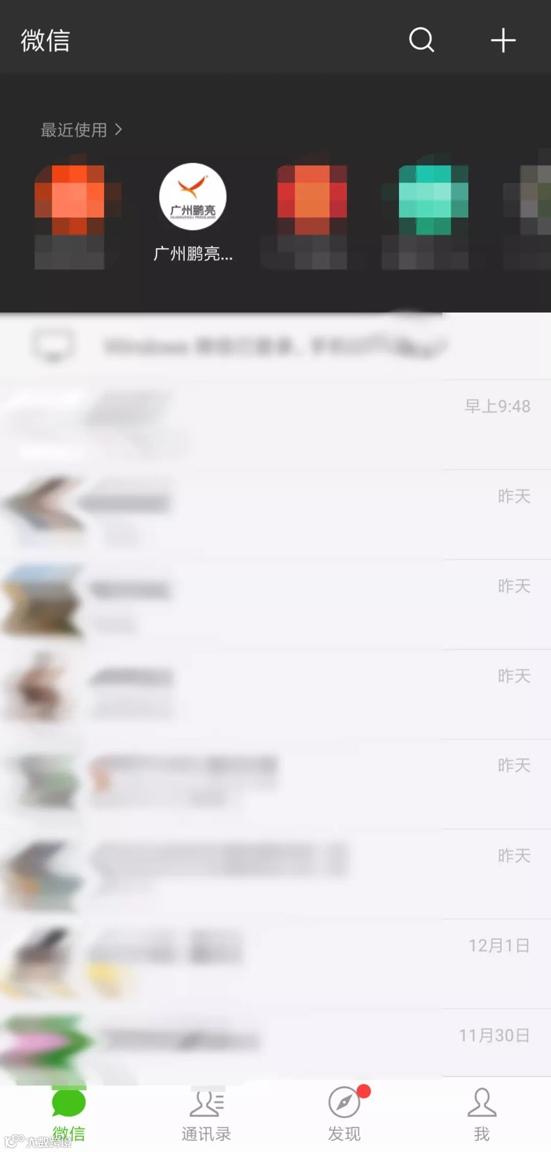 2.识别一次后,以后可在微信聊天页面拉至顶部即可找到[广州鹏亮商贸旗舰店】小程序直接进入,无需再次扫码。