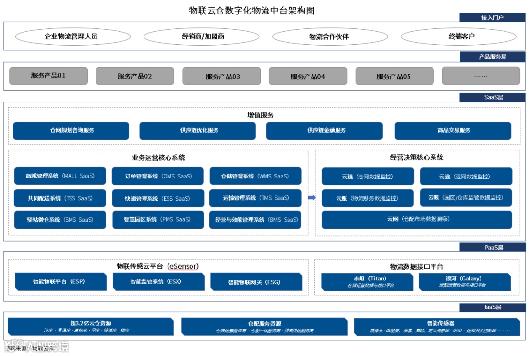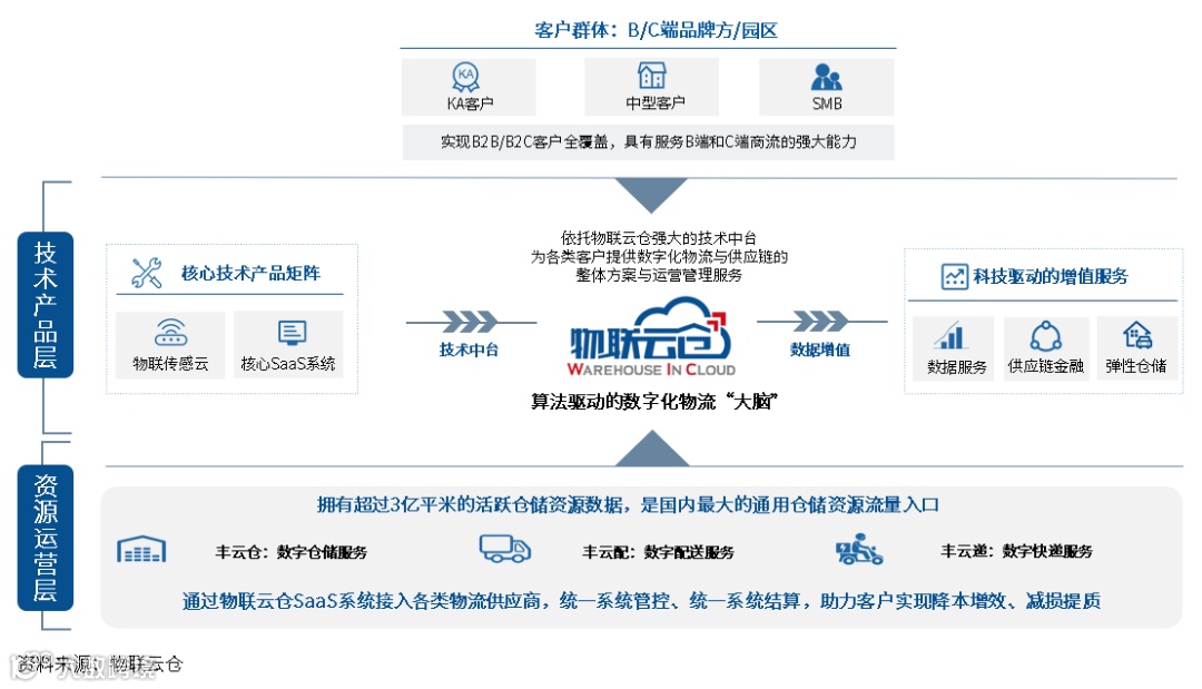 作为产业互联网综合服务平台,物联云仓正在通过互联网仓储大数据+云仓科技+数字化运营+数据增值服务,结合智能物联网应用与人工智能等技术,为企业客户提供数字化物流中台整体解决方案,包含SaaS系统、物联传感云为核心的技术产品,以及数据服务、供应链金融、弹性仓储为核心的增值服务。