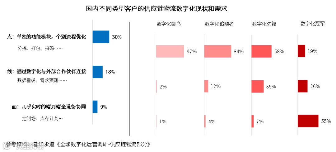 从以上数据可以看到,在仓储、运输、配送,以及仓配衔接、供应链网络等企业物流数字化场景落地中,不同类型客户都不同程度地存在信息流、商流、物流的错位错配的“黑箱”现象。例如: