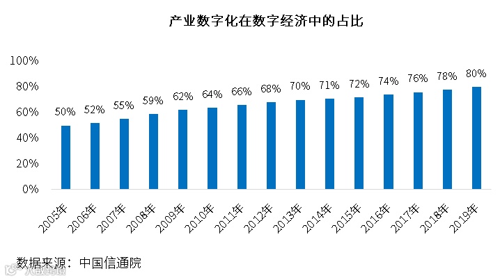 我们看到,数字经济已经渗透到经济活动的方方面面,不同产业都在大力推行数字化;“产业数字化”的占比份额逐步提升,截止2019年占比已经达到80%,印证了数字化在经济生活中的地位正日益显著。