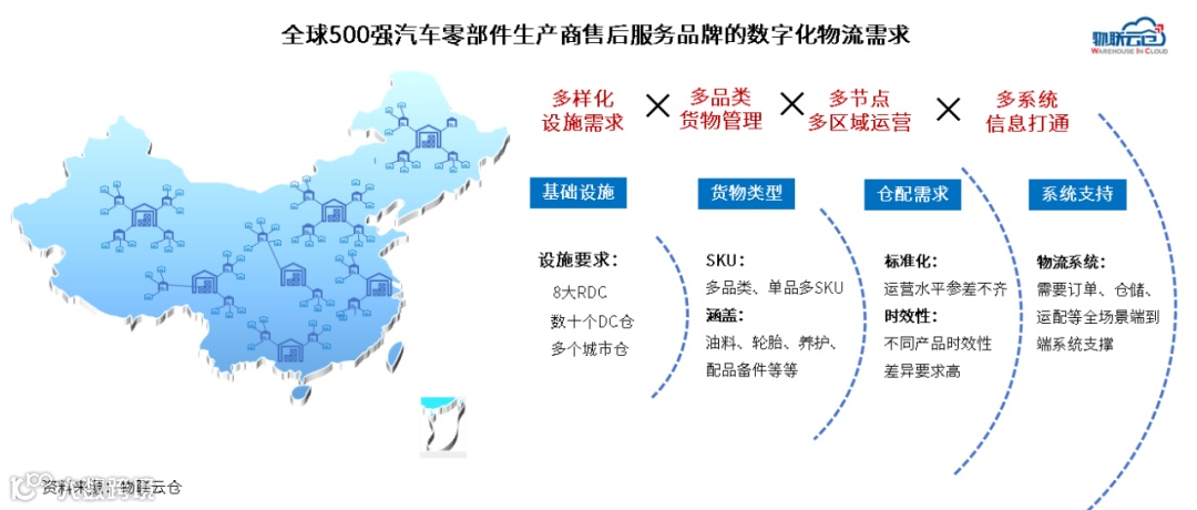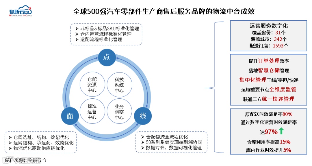 例如,针对目前汽车零部件生产商的授权维修厂物流体系种种难点、痛点,物联云仓结合丰富的企业客户服务实战经验,为某全球500强汽车零部件生产商的售后服务品牌提供了数字化物流中台解决方案。通过物流中台服务,物联云仓有效满足了该客户“多样化设施需求、多品类货物管理、多节点多区域运营、多系统信息打通”的数字化物流需求,助力客户汽车零部件物流全方位的降本增效。