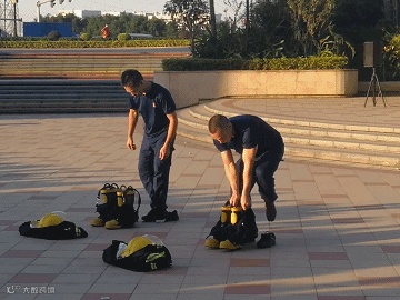 祈福消防中队的消防战士现场演示抛水带、穿消防服。