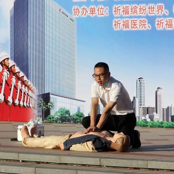 祈福医院急救专家现场为大家演示心肺复苏术、伤口包扎以及常见身体损伤的应急处理方法。