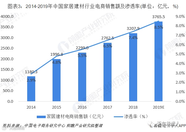2009年以来,越来越多的传统家居建材企业开始进入电商领域。据中国电子商务研究中心的统计数据显示,家居建材行业线上销售规模从2009年的177亿元,增至2018年的3207.9亿元,复合增长率达38%,明显快于线下销售增速水平。2014-2018年,家居行业线上渗透率由2.9%增长至7.4%,预测2019年全年将增长至8.5%。