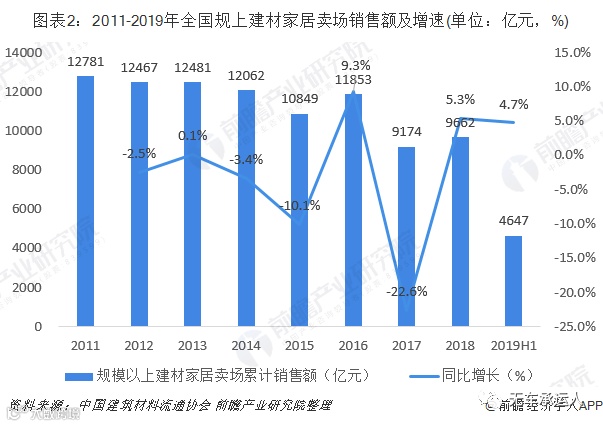 受全国房地产市场的直接影响,全国建材家居市场2019年上半年保持“整体稳定、小幅波动”的主流趋势,但市场并未出现单边大幅上扬局面,整体发展仍保持低位维稳向好。2019年1-6月,全国规模以上建材家居卖场累计销售额为4647亿元,同比上涨4.7%。