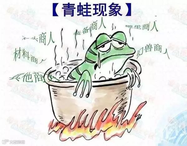 把一只青蛙直接放进热水锅里,由于它对不良环境的反应十分敏感,就会迅速跳出锅外。如果把一个青蛙放进冷水锅里,慢慢地加温,青蛙并不会立即跳出锅外,水温逐渐提高的最终结局是青蛙被煮死了,因为等水温高到青蛙无法忍受时,它已经来不及、或者说是没有能力跳出锅外了。