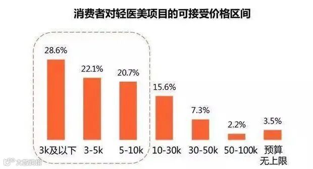 美团医美平台热搜前十的轻医美项目价格大多在几百到几万元之间,且并不集中在高价区间。这与调研数据中消费者对轻医美项目的可接受价格区间基本吻合:可接受3000元~10000元的占比超40%。