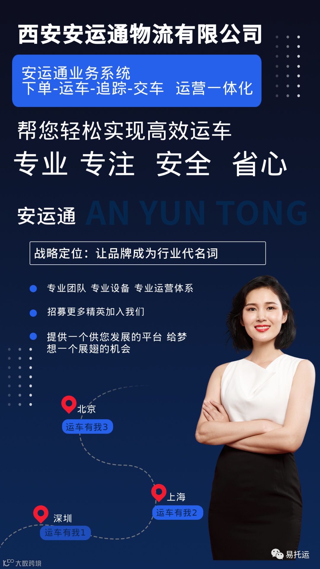 安运通有限公司位于陕西省西安市三桥启航时代,是一家专门从事汽车托运行业的专业物流公司。一体化的运营系统,从下单到交车,全程线上服务,是西安乃至全国行业领先的专业托运公司。