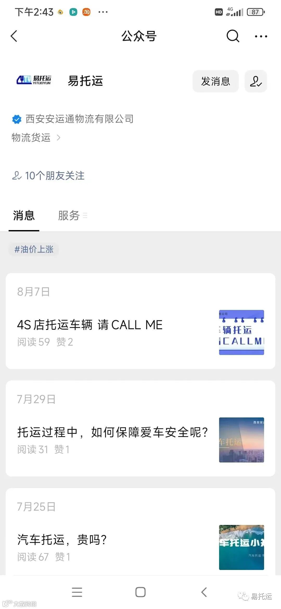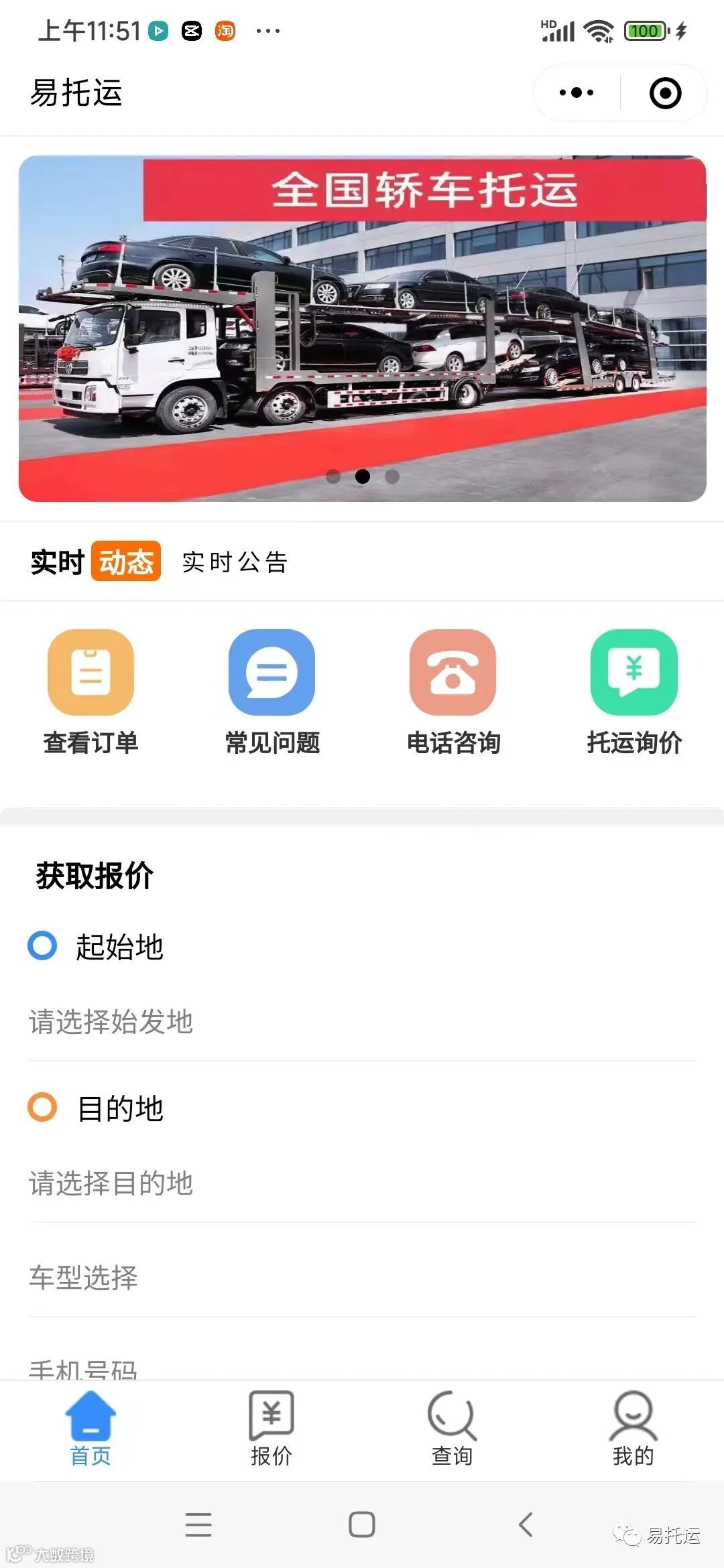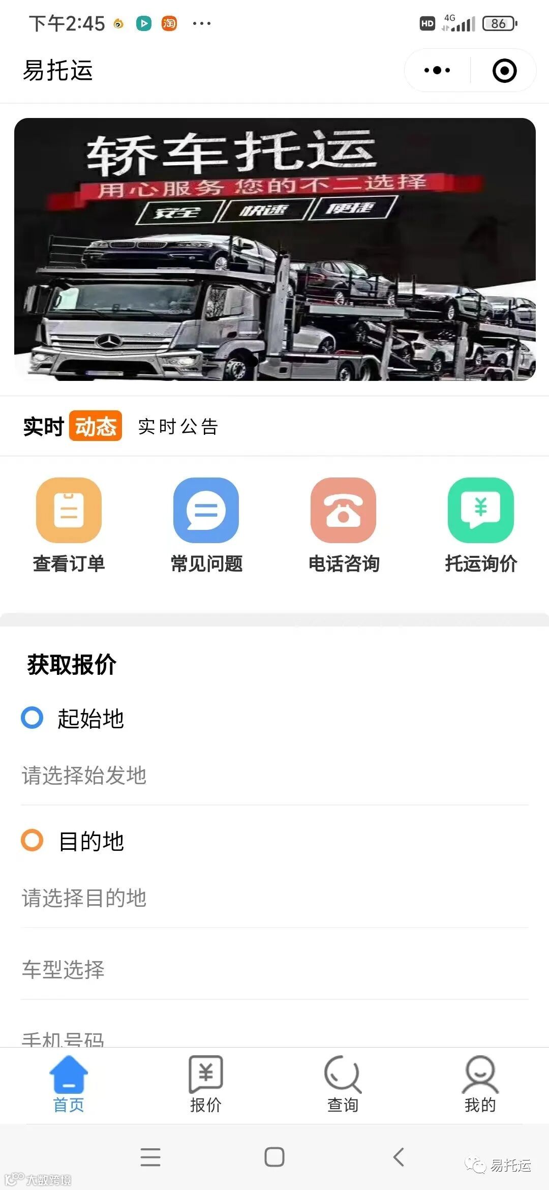 微信搜索-公众号-易托运,点击右下角“汽车托运-查询价格”菜单,授权登陆。