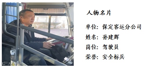 保定客运分公司(原一公司客车二队)旅游班线驾驶员孙建辉师傅,25年来手握方向盘,心怀责任感,在日复一日的行车路上,用坚守与专注诠释着“安全第一”的承诺。截至目前,他已累计安全行驶160万公里,从未发生过一起责任交通事故,多次被评为单位“安全驾驶标兵”。
