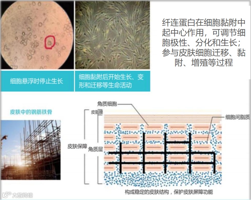 纤连蛋白(Fibronectin,FN)是人体中广泛存在的一种蛋白质活性物;是皮肤细胞间基质和基底膜中的主要非胶原性糖蛋白。由两个分子量为250kDa的单体组成,有多个功能片段。在体内可与纤维蛋白、肝素、胶原、DNA以及细胞表面受体等物质紧密结合。