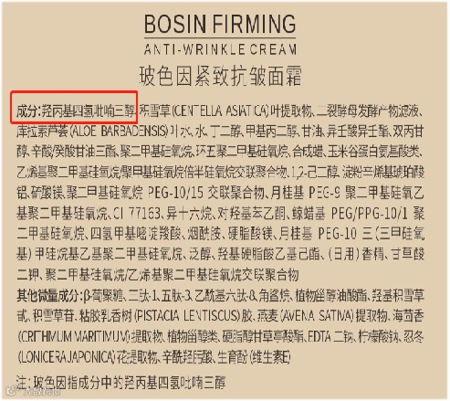 超越市面上99%同类产品,玻色因实量添加10%,羟丙基四氢吡喃三醇排于成分表首位!