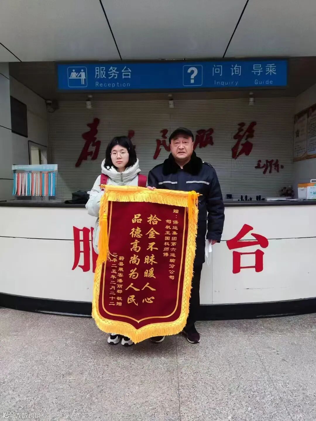 3月2日上午,保运六公司客运站内迎来了一位满怀感激之情的乘客,他手捧一面绣有“拾金不昧暖人心 品德高尚为人民”的锦旗,专程前来感谢保定至蔚县驾驶员王国权的善举。
