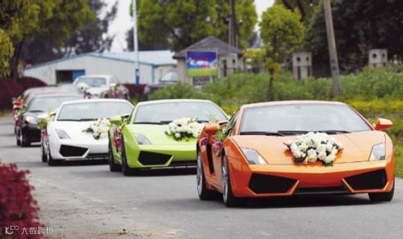婚车一堆的林肯加长、法拉利保时捷跑车,但多数都是租的····